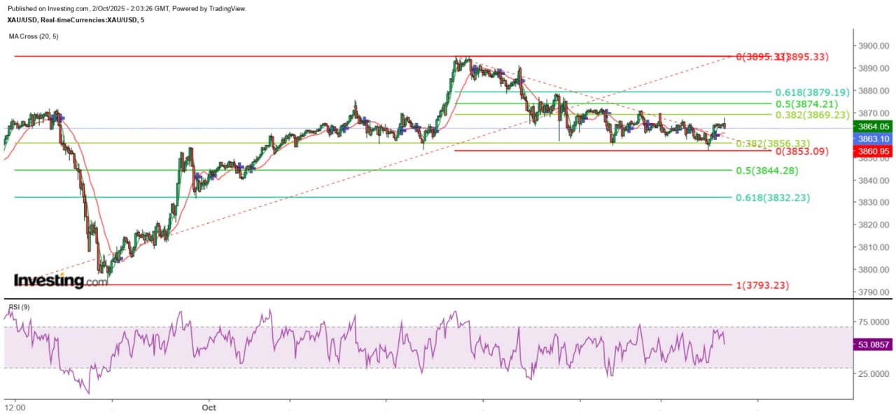 现货金价在今早亚洲市早段低见3853美元后反弹,最高升至3865美元。从5分钟图观察,金价昨天以来的累计调整幅度,约为9月30日以来最大升幅的38.2%(3856.33),我将其称为强势调整,即5分钟图的上升趋势未遭到破坏,后市能否再创新高则是另一回事。若从小时图观察,金价仍低于20SMA(3870.75),故须重新守稳该线才有望进一步攀升。短线而言,随着金价波动性加剧,且走势偏弱,保守估计,3875至3880美元将成为金价日内主要阻力,且仍有可能调整过去两日最大升幅之50%,即有机会测试3844.28美元支持。