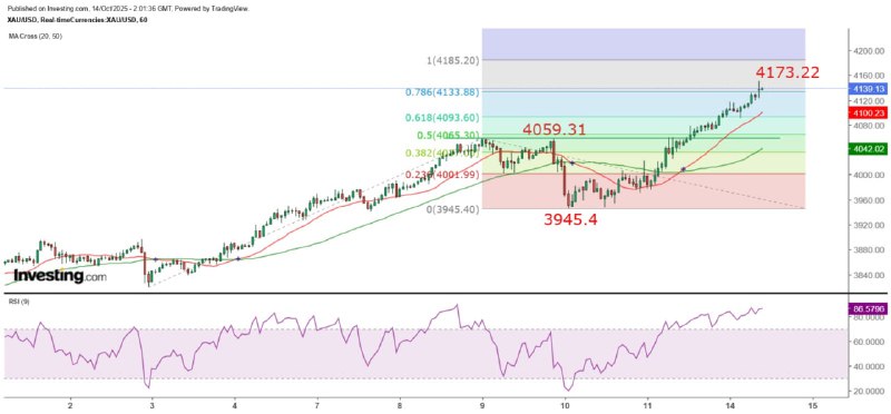 从10月2日以来的小时图走势分析,金价自10月10日展开的第二轮升浪,升幅若与前升浪相同,则可升至4185.2美元。若以金价在10月13日上破阻力位4059.31美元计,量度上升目标则为4173.22美元。换言之,金价短中期突破4200美元的机会不大。移动平均线方面,20小时SMA(现约为4096)明显是强支持,一旦连续三小时收低于该线,预料金价将展开具深度的调整,暂以4047美元为下跌目标。