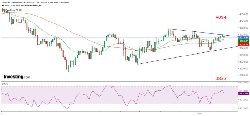 虽然今早金价收复了大部分失地,但仍下跌若10美元,且在4000美元关口仍见沽压,以TD线量度小时图的走势,若金价向上突破下降轨,上升目标约为4094美元,跌穿上升轨的量度下跌目标则约为3853美元,在ADP公布10月就业报告前,金价本周料困于3900至4000美元之间,若其后中美公布达成贸易协议,金价料失守3900美元。
