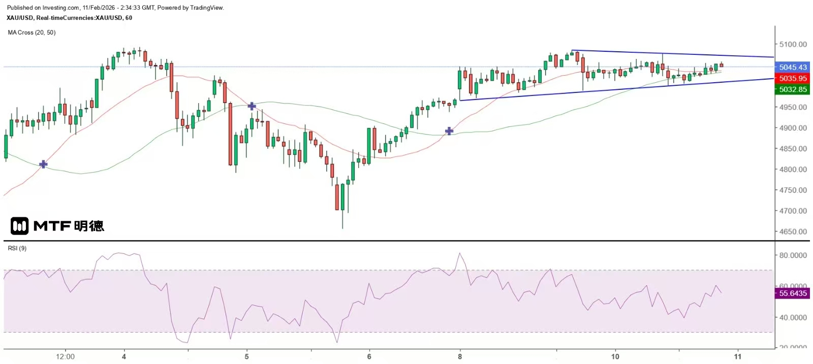 不过,从5分钟图所见,金价仍然维持高波动性,之前提到的20及50SMA强支持或阻力,其有效性逐步降低,但仍可为投资者带来获利机会。美国劳工部今晚公布的1月非农就业报告,或令金价的波动性更大,尤其就业职位变动出现「半生不死」的状况,将会加剧好淡双方角力,即使如此,我仍预期金价日内难以升破5100或5110美元,但失守4960美元的可能性亦不大。