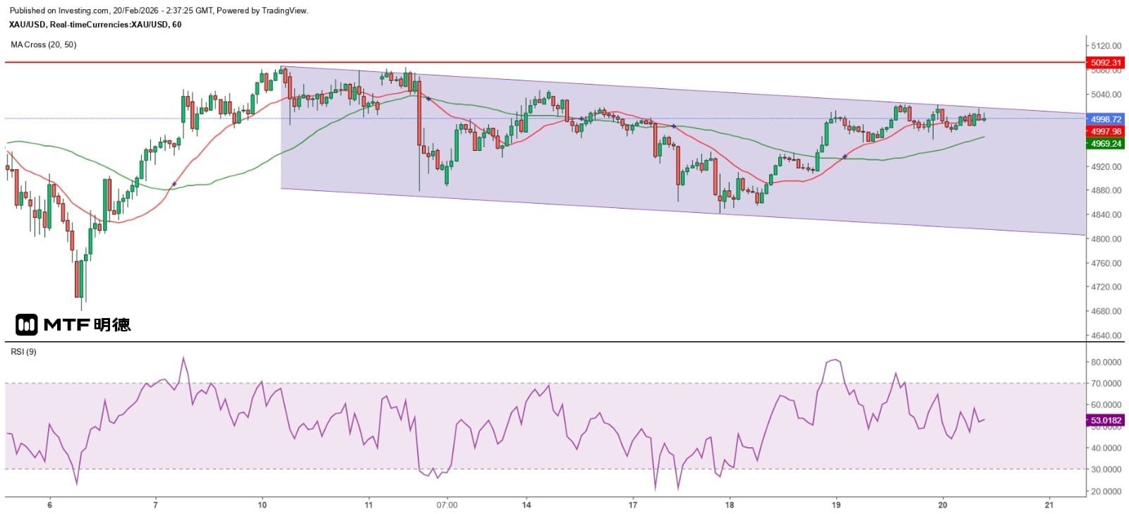 在过去三日的农年新年假期,金价大致维持区间波动,现货金价虽曾三度升至5000美元以上,但却未能收高于该位。从日线图所见,金价在过去三日皆收低于20SMA(现约5007.33),是去年11月10日重上20SMA以来连续三日收低于该线,反映金价进一步大跌的风险增加。