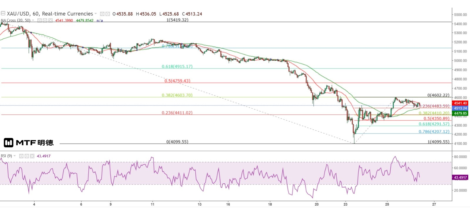 金价维持缓步上升,惟昨天在东京市早段高见4552.45美元后,未能欧洲及纽约市再创日内新高,走势上呈缓步下行整固形态,与本周一纽约市开始的走势相似。如维持目前的形态发展,昨天在纽约市尾段的调整低位应不会失守,金价日内挑战4660美元的江恩水平角机会较大。