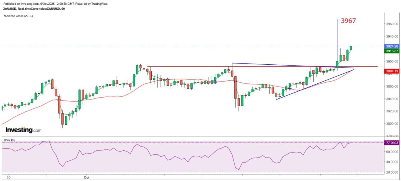 美國政府部分部門停運,導致美國勞工部未能如期在上周五公布9月非農就業報告,原訂在本月中公布9月CPI亦很可能要延後公布。金價則繼續創新高之旅,上周五大致在3877至3891美元的相對高位橫行,今早在亞洲開市初段發力狂飆,最低但見3884.5美元,其後突破3900美元,高見3920美元水平後才略為回調,但低位僅輕微試穿3900,高低差距拉闊至35美元,調整後再發力,迫近3925美元。
