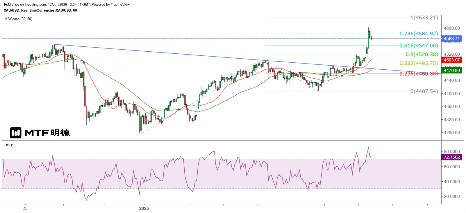 上周五金價借助欠佳的12月非農就業數據向上突破4500美元,高位觸及4517美元,雖然在紐約午市回落,但低見4482美元後再度攀升,最終收在4510.45美元,屬於江恩315度角的次要阻力,向下或向下突破本不確定。然而,今早金價在亞洲市以裂口高開後持續攀升,最高升至4601.17美元,隨後在5分鐘圖出現穿頸破形態,並逐步回落。