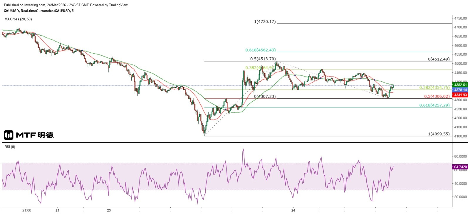 昨天指出,投資者宜待金價守穩5分鐘圖的50SMA(現約4387)後才部署買入,而金價在昨天接近歐洲午市時升破該線,其後略為回穿該線後重新守穩其上,在紐約開市前更大幅拉升至4462.65美元,之後沿50SMA反覆上升,高見4512.49美元後才受阻回落。