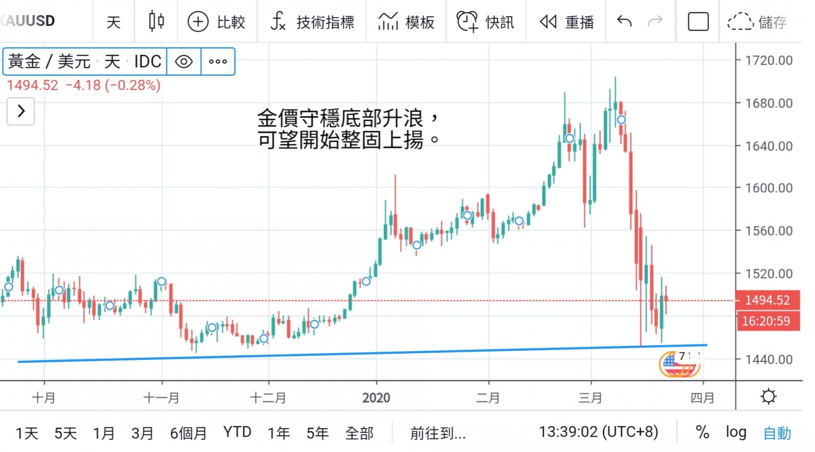 但此段市场情绪只要开始回稳,此位置是相当理想的吸纳良机,可逢低吸纳。美元的升势虽阻碍金会反弹,但各国印钞下,亦相信会有资金重新吸纳黄金以作避险对冲。