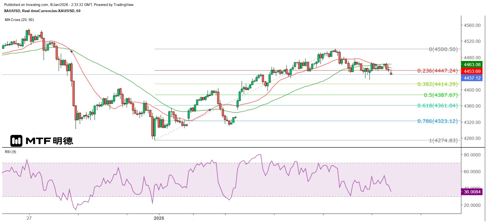 从小时图所见,金价逐一失守20SMA(4454.14)及50SMA(4463.26),本周三高见4500.5美元后下跌,其后走势渐呈横行形态,而最高一小时收市价亦逐步下降,高位横行整固预示金价即将出现突破性走势,而目前的走势显然倾向下跌,昨天金价短线触顶的预期亦已兑现,4410美元相信是日内首个下试目标,而仍预期金价倾向跌至4387.67美元(12月31日以来最大升幅50%所在价位)后才有望回稳。