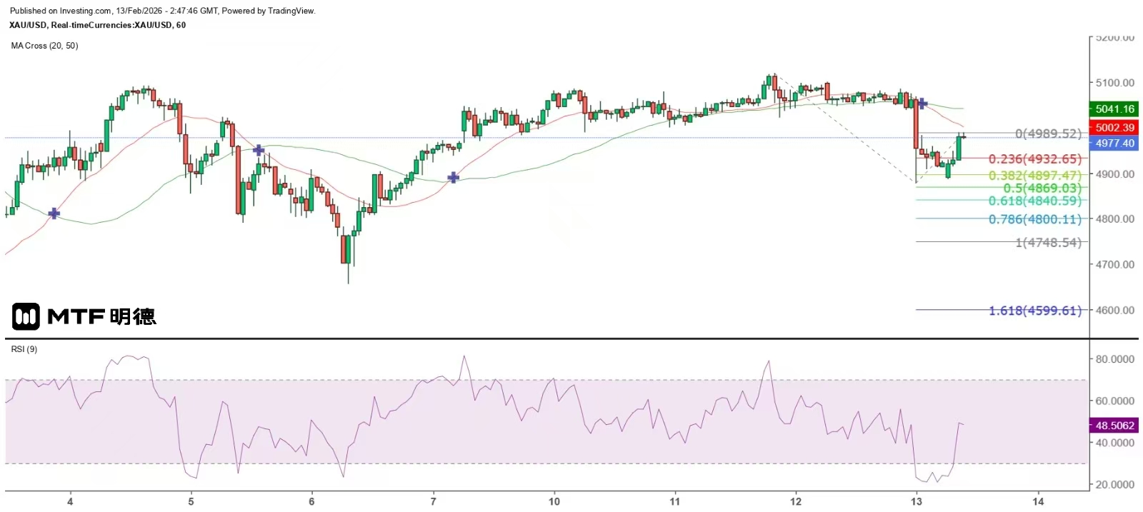 从日线图观察,金价本周反弹最高至5119.24美元,接近由历史高位5595.46美元以来最大跌幅61.8%反弹位5140.37美元,但昨天大幅下跌且失守20日SMA(现约4746),今早的反弹高位4986.31美元,则接近昨天最大波幅的50%水平(4889.37),其后再度急及试穿4980美元。由此推断,金价在日线图的反弹结束,在小时图反弹亦至好淡分界线受阻,进一步下跌的风险大大增加。
