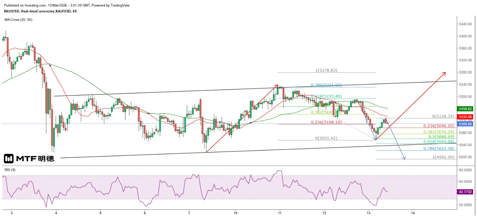 昨天金价表现可谓呈现三种形态,亚洲上午市呈三角形反复波动,而在欧洲上午市则横行,最高升至5191.82美元,进入纽约市后则展开单边跌市,尾段跌至全日低位5055.42美元,反映不同地区的投资者对金价的观点差异极大。金价在今天亚洲市早段升至5128.39美元,接近昨天亚洲市的低位5126.13美元,属于典型的支持位失守后成为反弹阻力。