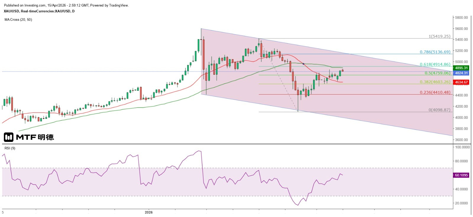《金价受制50日线或重纳跌浪》15/4/2026 10:56 完稿